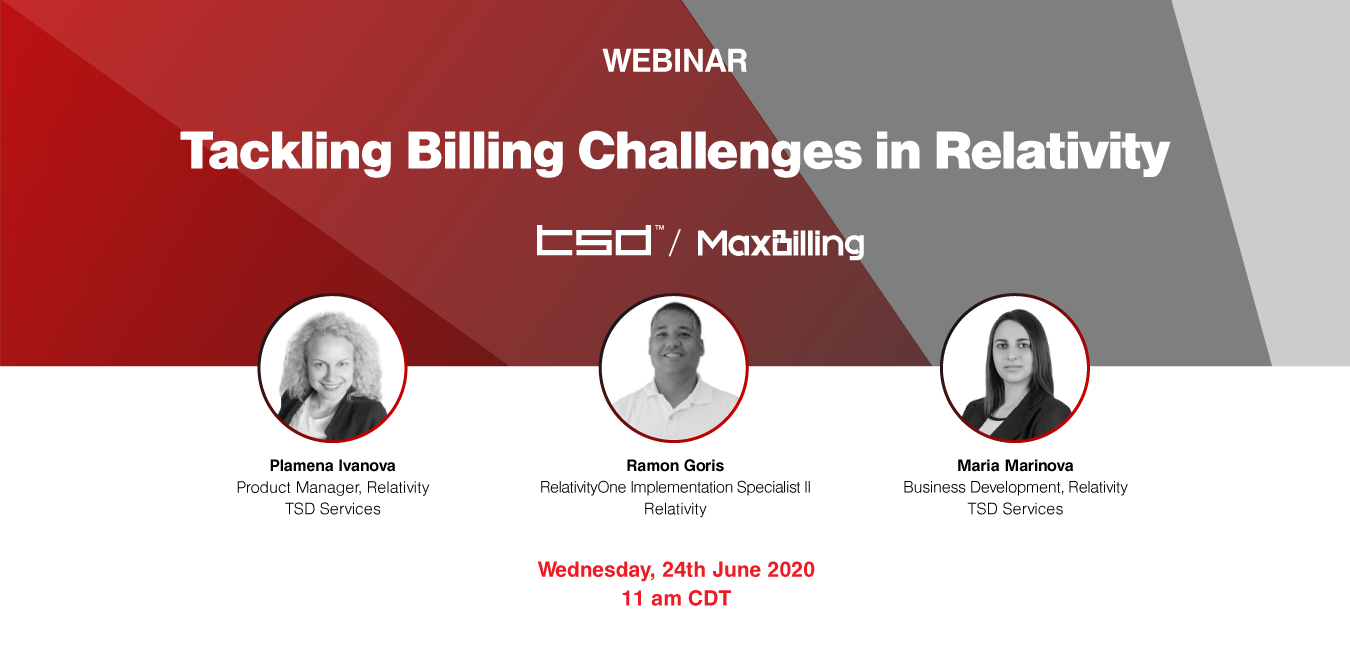 On June 24th at 11 am CDT experts from both TSD and Relativity will provide insights about the most common billing challenges in the platform based on their hands-on experience and feedback from clients of the eDiscovery software. Furthermore, the speakers will also share the best solutions to those challenges achieved through the capabilities of the comprehensive billing application for Relativity – MaxBilling. By attending this webinar, you will additionally receive the special opportunity to be demonstrated and explained exactly how each feature and functionality of the product can respond to your unique billing scenario.